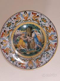 Piatto (2 di 2) istoriato in coppia col precedente, si differenzia per il soggetto rappresentato al centro del cavetto. In questa maiolica è rappresentata “La Nascita di Adone”, concepito da una relazione incestuosa tra Mirra, trasformata dagli Dei in albero della mirra, e suo padre Cinira.cura. La maiolica si presenta con vistose rotture restaurate in maniera