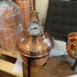 Alambicco distillatore da 5 litri a serpentina con base in legno. Termometro installato, tutto in rame massiccio uso alimentare, tubi serpentina uso sanitario. Prodotto made in Italy. Spedizione in tutta Italia, contrassegno accettato.