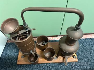 alambicco, specificamente un distillatore in rame, che è un apparecchio utilizzato per la distillazione.