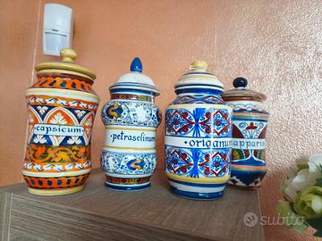 Questi oggetti sono albarelli da farmacia in ceramica della "Origanum Art Collection" prodotti da Tognana. Materiale: Ceramica rifinita a mano. Design: Ispirati agli antichi vasi speziali italiani con motivi ornamentali colorati. Contenuto: Le scritte sui vasi indicano nomi di spezie o erbe medicinali come capsicum, petraselinum e origanum.