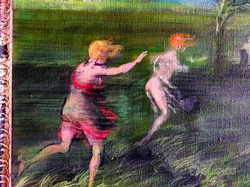 "Due figure in fuga nel vento", opera unica del maestro Sughi, olio su tela, 50x60, firmato in basso a destra. Autenticato e archiviato.