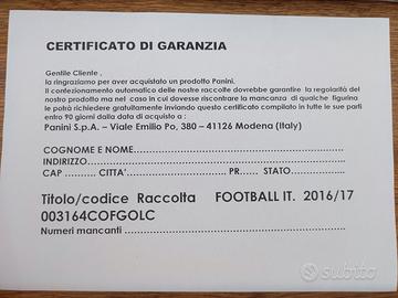 Vendo album calciatori Panini 2016-2017, comprensivo di cartellina rigida, completo di tutte le figurine (anche degli aggiornamenti e delle sezioni aggiuntive) e del certificato di garanzia rilasciato dalla Panini. Condizioni ottime come da foto.