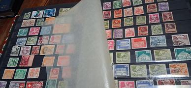Album di grande formato, con pagine nere, con francobolli di Italia, Svizzera e altro.