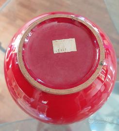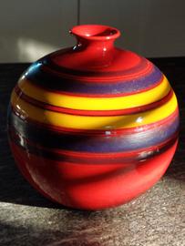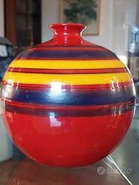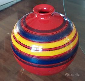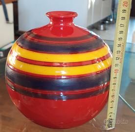 Vaso sferico di colore rosso a fasce orizzontali gialle e nero/viola prodotto negli anni 60/70 da Bitossi per Rosenthal Netter