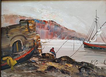 Il dipinto raffigura una scena marina con un pescatore e imbarcazioni tipiche. Lo stile è caratterizzato da una tecnica a spatola molto decisa e materica. Le pennellate sono larghe e cariche di colore (impasto), conferendo tridimensionalità e dinamismo alla scena. La tavolozza è luminosa, tipica della pittura di genere del secondo Novecento italiano.