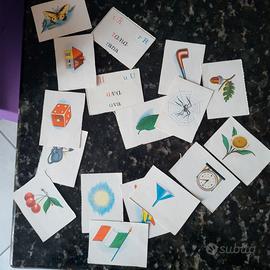 Compreso di lettere in cartone mobili, foglietti con figure e nel retro come si scrive in corsivo e stampatello, foglietti con solo scritte in corsivo e stampatello, foglietti con stampa e parole da sillabare.