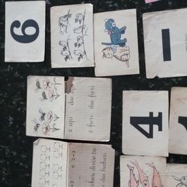Ed ancora fogli con disegni e numeri stampati nel retro, foglietti con stampe e numeri dietro e palline corrispondenti al numero con i segni matematici per imparare a contare.