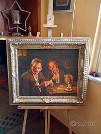 I 2 amici – Alfonso Grassi (olio su tela) Dimensioni: 50 × 45 cm (circa) Firma: In basso a sinistra “A. Grassi” Archivio: Opera registrata presso l’Archivio Storico ed Artistico “Maestro Alfonso Grassi” Opera originale caratterizzata dalla calda tavolozza e dalla tipica sensibilità pittorica dell’artista. In particolare il contrasto del biancoscuro. Provenienza: collezione privata. La cornice coeva, con normali segni del tempo, è inclusa a titolo gratuito. ---------------------------------------------- La pittura è anzitutto un’arte concreta, positiva e controllabile in ogni suo aspetto. L’arte in greco si dice Tékne, che vuol dire tecnica, mestiere. Oggi la parola tecnica o mestiere, riferita alla pittura, è considerata dai cosiddetti modernisti qualcosa di quasi offensivo, mentre tutta l’opera dei maestri antichi, fino allo scadere dell’Ottocento prova esattamente il contrario. È quello che ha capito Alfonso Grassi che è sempre andato diritto per la sua via, facendo sempre della Vera pittura ed affrontando instancabilmente quanto alla Vera pittura è collegato. Gli auguro sinceramente di continuare su questa via e di perfezionare sempre più il suo mestiere di vero pittore. Giorgio De Chirico Marzo 1971