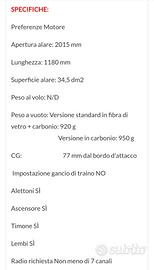 Motoaliante Tucan tutto fibra carbonio, completo servi motore allestito come descritto da RCRCM,sostituito solo servi flap.Ottimo volatore preciso e veloce.Consegna solo a mano dopo visione.