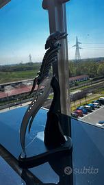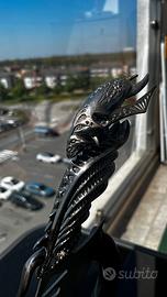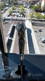 Coltello stile Alieni Bellissimo coltello decorativo dal design unico, con impugnatura a forma di un alieno ricca di dettagli. La lama è curva, elegante e traforata, perfetta per chi ama oggetti particolari o da collezione. ✨ Caratteristiche: Design fantasy / gotico Lama in metallo con lavorazioni decorative Base inclusa per esposizione Colore: nero lucido + acciaio 📏 Ideale come: Oggetto da collezione Decorazione per casa, studio o gaming setup Regalo originale 📦 Condizioni: ottime, come da foto ⚠️ Venduto come oggetto decorativo (non uso professionale)