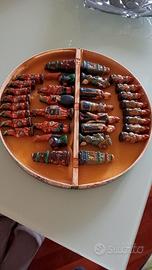 scacchiera Peruviana in legno decorata a mano con pezzi in ceramica dipinti a mano raffigurante gli spagnoli conquistadores e gli indios , scacchiera degli anni 90