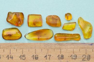 N. 9 pietre di ambra baltica lucida contenente ognuna una inclusione, provenienti da una collezione privata.