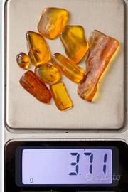Nessun trattamento, ambra baltica naturale al 100%. Galleggia in acqua salata e odora di pino se riscaldata e testata con luce UV con riflessi blu.