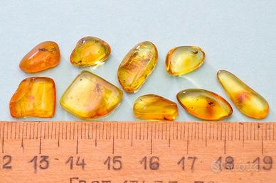 N. 9 pietre di ambra baltica lucida contenente ognuna una inclusione, provenienti da una collezione privata.