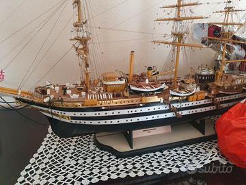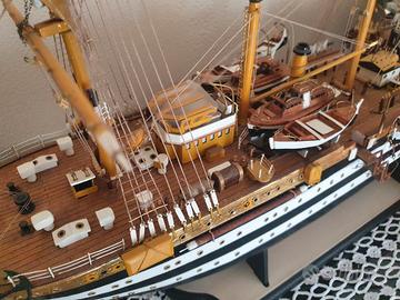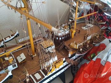 Descrizione Splendido modellino veliero Amerigo Vespucci. Modello assemblato pezzo per pezzo a mano in legno. In ottime condizioni completo di vele, scialuppe di salvataggio completamente fatta a mano pezzo per pezzo Lunghezza 90 cm Altezza 63 cm Larghezza 23 cm