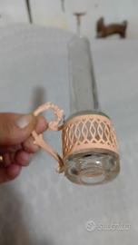 quattro Ampolle usate come porta profumi ,erbe prodotti chimici ,di farmacia o botteghe artigiane ,ferro battuto e vetro anni 50 /60