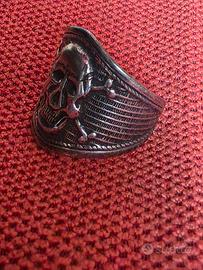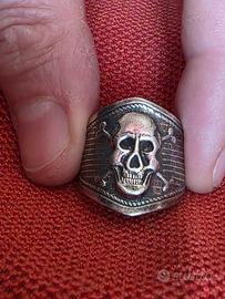 Questo oggetto è un anello da squadrista, spesso realizzato in lamiera stampata negli anni '20, caratterizzato da un teschio a sbalzo su fondo zigrinato.