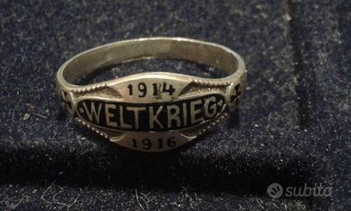 Splendido anello, con fascia centrale a smalti neri, che reca la scritta WELTKRIEG (Guerra Mondiale) 1914 1916 ai lati due Croci di Ferro in smalto nero. L'anello in argento 800%, come da marcatura interna, è perfettamente conservato ed ha un diametro di circa 19/20 mm. Fu realizzato durante il Primo Conflitto Mondiale WW1. Splendido oggetto carico di storia ad un prezzo ancora abbordabile per i collezionisti PRUSSIA GERMANIA WW1 di non facile reperibilità.