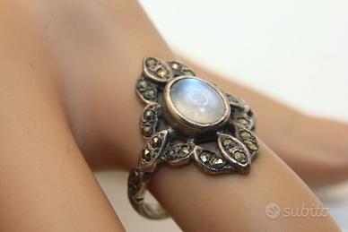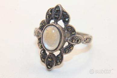 Splendido anello in stile Art Deco che cattura l'eleganza di un'epoca passata. L'anello presenta una struttura in argento con una patina scura che ne sottolinea il carattere antico. Il design è dominato da una gemma centrale ovale di madreperla con un delicato luccichio iridescente. Intorno alla madreperla si sviluppa una cornice elaborata e ricca di dettagli a forma di foglia o petalo, interamente tempestata di piccole e brillanti pietre di marcasite. Le marcasite si estendono anche lungo le spalle del gambo dell'anello, aggiungendo ulteriore scintillio e continuità al design. La misura interna dell'anello è di 17,5 mm. È un gioiello raffinato e sofisticato, ideale per chi apprezza lo stile vintage e le creazioni artigianali.