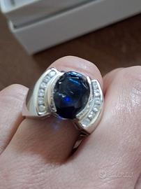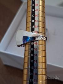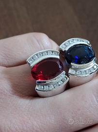 Anello in argento color rosso rubino centrale e piccoli zirconi bianchi.Misura 14.L'altro anello ha una pietra color zaffiro blu e zirconi bianchi.Misura 16 ed è in regalo perché ha la pietra leggermente scheggiata. Peso 10 grammi ciascuno.Non so se si vede bene il timbro, comunque tutti e due sono stati in gioielleria e sono in argento 925. Mai usati,sono rimanenza di negozio.