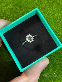 Anello in argento 925 con pietra principale opale su sfondo nero, tempestato di zirconi sulla corona circostante.