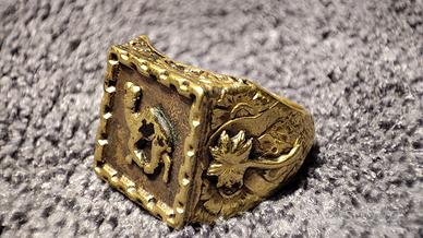 anello vintage in metallo dorato con decorazioni in rilievo su più lati.