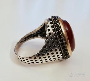 Anello (da uomo) in Argento 925 con pietra ovale in corniola e giro di marcasiti.