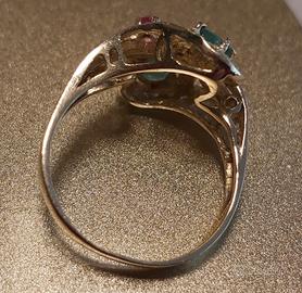 Anello vintage contrariè in oro giallo 18 kt, con pieyre di colore (smeraldi, rubini) e piccoli diamanti.