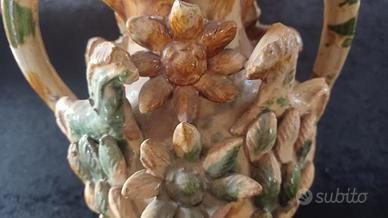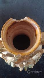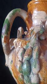 Sul corpo ornati plastici a rilievo a forma di animali e fiori. Marezzato in verde e giallo.
