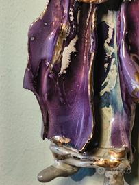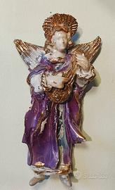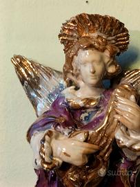Angelo in maiolica a lustro- stile Bonaccorso- vintage anni'60/70 Bellissima statuetta da parete raffigurante angelo musicante con mandolino, realizzata in maiolica smaltata con riflessi a lustro e dettagli dorati. Produzione artigianale italiana, attribuibile alla scuola/ambito Bonaccorso (seconda metà '900) Colori vivaci (viola, oro, bianco), lavorazione materica con smalti colati tipici dell'epoca. Dimensioni: circa 30 cm (vedi foto con metro) Condizioni: buone Prezzo richiesto: 49E Perfetto come elemento decorativo vintage o da collezione. Consegna a mano o spedizione accurata disponibile.