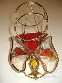 Particolare angioletto (oggetto di dichiarata manifattura artigianale) di elegante struttura metallica dorata, ornata da sottili ricami di filo dorato, da tre perline rosse ed una stella, accuratamente saldati a mano; rivestita nei suoi diversi interstizi di plastica trasparente di diversi colori (predominanti il rosso vivo e la tonalità neutra trasparente) che imitano vagamente il vetro soffiato “a più bollicine” (come da foto). La caratteristica di questo piacevole oggetto, oltre alla letizia natalizia che esso esprime attraverso forme e colori, è la presenza dell’altrettanto elaborato portacandele sul retro (di foggia articolata che richiama vagamente la forma a spirale), utilizzabile per posizionarci dietro un piccolo lume a fiamma: una luce calda e natalizia, una fiamma trasparente che rende luminoso questo angioletto, una volta accesa. (Nota: ad esso è stata da noi associata una candela rossa di cera, profumata ad aroma di fragola, di forma cilindrica e lievemente svasata verso il basso. Trattasi, però, di una candela nuova di acquisto molto più recente).