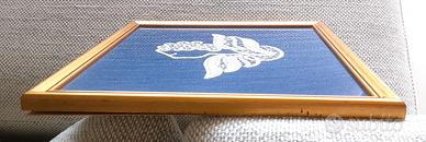 Angioletto in pizzo di Cantu', incorniciato sotto vetro con cornice in legno dorato e fondo in velluto blu. Fatto a mano, artigianato Canturino. Dimensioni 30 x 33 cm. Senza difetti.