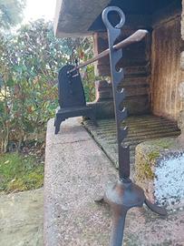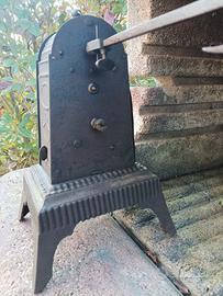 antico girarrosto a carica meccanica con reggispiedo e con base in ghisa. Materiale ferro, epoca 1890/1920 circa. Presente un po' di ruggine dovuta all'età, il meccanismo interno è completo e nessun danno agli ingranaggi. Necessità di pulizia e lubrificazione. Funzionante perfettamente, se richiesto posso inviare video mentre gira.
