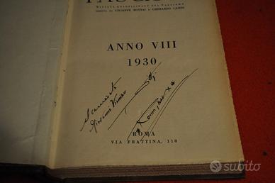 3 annualità complete composte da 24 fascicoli di circa 40 p. ciascuno rilegati assieme, con elegante coperta in cuoio a sbalzo con titoli d'oro al piatto ed al dorso, con 5 nervature ed alcune piccole spellature ed abrasioni, taglio superiore dorato e decori incisi. Con dediche e firme autografe di Giuseppe Bottai ministro dell'educazione nazionale, governatore di Roma e di Addis Abeba durante il periodo fascista.