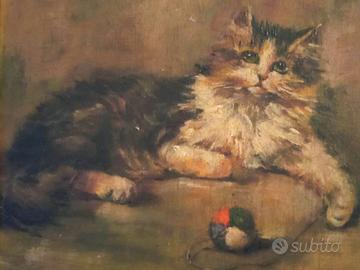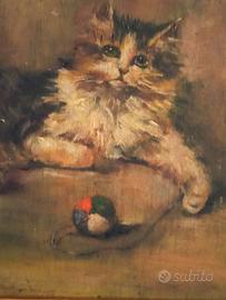 Anonimo - Gattino sdraiato che gioca con un gomitolo. Olio su tavola in cornice dilegno coeva. Epoca primi '900. In buone condizioni. Dimensioni: opera cm 17 x 15,5 in cornice di cm 32 x 31 x 4.