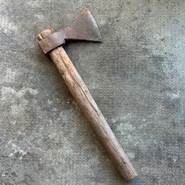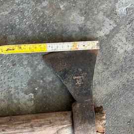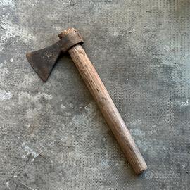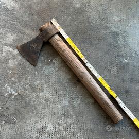 ascia/accetta d'epoca originale RUBINO, marchio storico italiano con punzone a stella ben visibile sulla lama. Un pezzo autentico e robusto, ideale per collezionismo o progetto di restauro. • Dimensioni: Lunghezza totale 47 cm; tagliente (lama) 11 cm. • Stato: Struttura in ferro forgiato molto solida con patina originale. Lama da affilare. • Caratteristiche: Manico in legno massello vissuto, attrezzo pronto per essere riportato a nuovo o esposto in ambiente rustico.