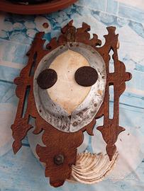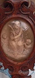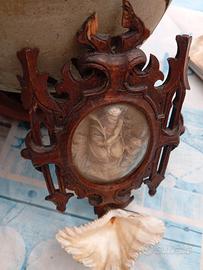 antica acquasantiera in schiuma di mare raffigurante Cristo con angeli con conchiglia e vetro a cupola 10x 7 cm l,ovale della schiuma co piccoli difetti della cornice in legno come da foto