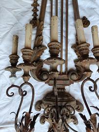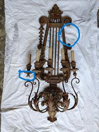 Presenta una decorazione mancante sulla destra a forma di palmetta, e un supporto ligneo dell'ultima candela a sinistra danneggiato, come si evidenzia dalla foto cerchiata in azzurro.