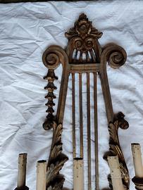 Antica monumentale applique a forma di lira in mogano e bronzo dorato in stile liberty (1895 1920) che incorpora elementi decorativi come foglie d'acanto e volute e che include supporti per lampade elettriche che imitano le candele.