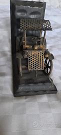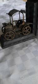 Modellino di macchina antica, realizzata artigianalmente in metallo e supporto in legno di noce, tutto in ottime condizioni.