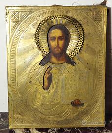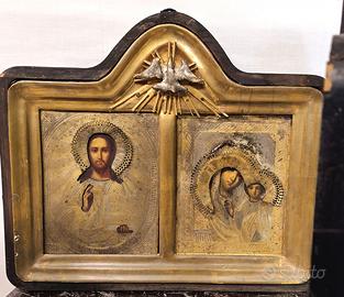 Manufatto devozionale risalente al XVIII secolo, composto da due icone russe originali raffiguranti Cristo Pantocratore e la Madonna con Bambino.