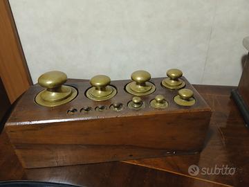 Bilancia a due piatti in ottone fine 800/primi 900 con un set completo di pesi sempre in ottone