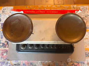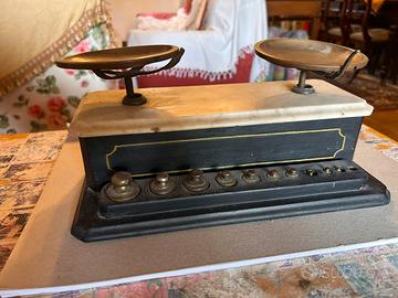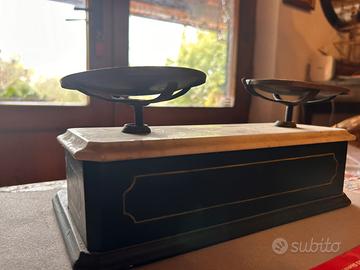 * Materiali di pregio: La bilancia è realizzata con una solida base in legno scuro, decorata da profili dorati che le conferiscono un tocco di eleganza. Il piano superiore è in marmo, un materiale nobile che ne testimonia l'uso professionale. I piatti e la serie di pesi sono in ottone o bronzo (ne manca uno l’ultimo)
