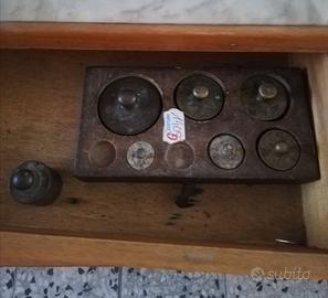 Antica bilancia da farmacia con piano in marmo, larghezza 43 cm, altezza 41 cm, profondità 21 cm. Nel cassetto contenitore con piccoli pesi per la bilancia.