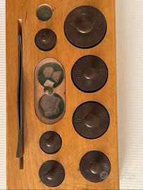 Antica Bilancia Monetaria di precisione usata dagli orafi con sette pesi in ottone e sei in alluminio nel loro contenitore dotato di pinzetta. La bilancia oltre all'anello per l'utilizzo è dotata di un supporto coevo in ottone finemente lavorato per un uso da banco. Misure cm larghezza 24 profondità 9 e altezza 33
