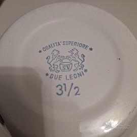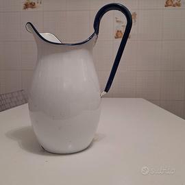 Vecchia brocca da toletta smaltata bianca con filo blu risalente agli anni '50 circa e prodotta dalla famosa fabbrica italiana "Due Leoni" di Bassano.