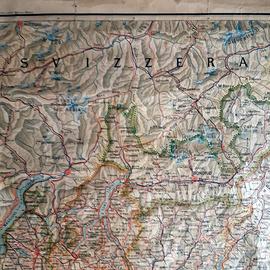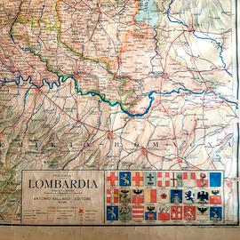 Carta /cartina geografica telata regione Lombardia. Editore A. Vallardi Periodo anni 20 Carta a colori con rilievo orografico marcato, idrografia dettagliata e puntuale rappresentazione della rete ferroviaria e stradale dell’epoca, elemento di particolare interesse storico-documentario. Sono chiaramente visibili i confini regionali e internazionali (con la Svizzera), i principali centri urbani (Milano, Brescia, Bergamo, Como, Pavia, Cremona, Mantova, ecc.), i corsi d’acqua maggiori (Po, Adda, Oglio, Ticino) e le aree alpine e prealpine. Nella parte inferiore è presente il riquadro con gli stemmi provinciali, tipico dell’iconografia Vallardi, che arricchisce il valore estetico e collezionistico del manufatto. Dimensioni cm 135 x 100 ben conservata C00004324-21 mappa