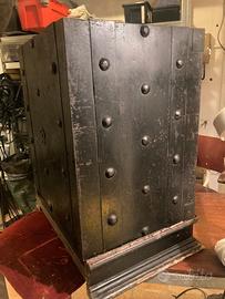 antica cassaforte in legno e metallo con lavorazioni sulle parti metalliche. apertura con chiave e serratura nascosta. richiesta €. 1.200 trattabili non si esegue spedizione. solo ritiro