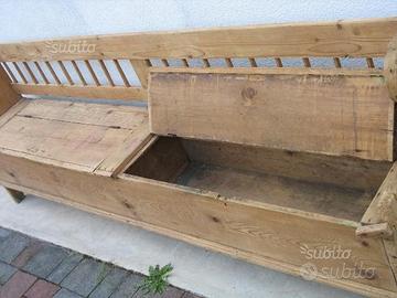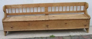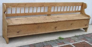 Antica cassapanca originale dell'inizio '900 riportata a legno naturale, misura cm 250 x 42 ed altezza alla seduta cm 48 mentre l'altezza alla spalliera è di cm 86. La seduta nasconde due preziosi spazi per poterci riporre tutto ciò che non trova posto altrove. La forma dei braccioli per consentire alla stessa di essere posizionata anche dietro un grande tavolo della stessa misura permettendone il scivolamento delle persone che andranno a prendere posto.