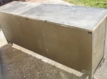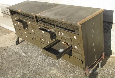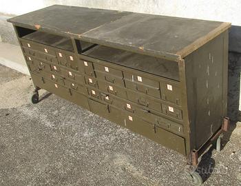 Cassettiera risalente agli anni '50, in metallo con piano in legno, 23 cassetti di varie dimensioni, 2 vani chiusi con ante a ribalta e 2 vani aperti. Le misure cm 187 x 51 x altezza cm 85. Posso consegnare con mio mezzo al puro costo del rimborso spese.
